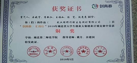 为了进一步引导我校广大学生增强创新创业意识,我院不仅有多只创业队伍参赛,还有学生前往现场观摩,并于其他高校学生进行交流学习。在指导老师曾建华、余建国老师的带领下,我院学生吴兴燚、苏西凤等人的作品《武汉薯兴生物科技有限责任公司》在本次湖北省大学生创业大赛计划竞赛中荣获银奖,在戴月、余建国老师指导和贾弋人、石晓宇等多位同学的努力下,他们的作品《武汉绿野行踪生态设计有限公司》也在本次创业计划竞赛中荣获铜奖。