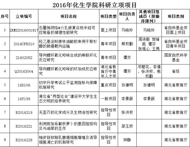 2016年化生学院科研立项项目