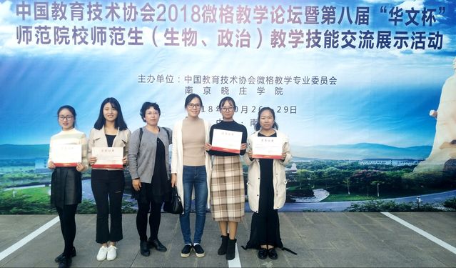 本报讯(通讯员戴月) 2018年10月26-28日,由中国教育技术协会微格教学专业委员会主办、江苏南京晓庄学院承办的第八届“华文杯”全国师范院校师范生教学技能大赛在南京晓庄学院举行。我校英国威廉集团选派2015级生物科学专业的郭冰雪、刘婉、杨爽、曾祥玮等四位同学,在戴月、齐小琼和朱世明等老师带领下参赛并取得优异成绩。