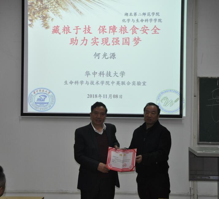 118日,华中科技大学理学院副院长、生命科学与技术学院博士生导师何光源教授应邀来我院作题为“藏粮于技保障粮食安全助力实现强国梦”的学术报告。化生学院全体老师及100余名学生聆听了报告。报告会由化生学院曾国平院长主持。