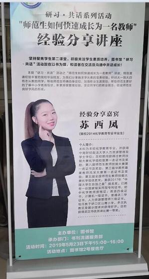 本网讯(通讯员江雅琪)5月23日我校在新图书馆二号报告厅举办了以“师范生如何快速成长为一名教师”的专题“研习·共话”活动。师生300余人参加。本次活动特邀现任教于硚口区山鹰小学化学与生命科学的优秀毕业生苏西凤同学为我们分享一名教师的心路历程。