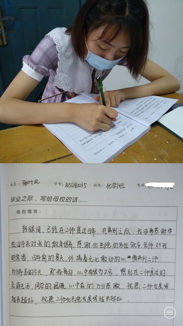 16级化学1班的张叶风同学在毕业留言薄上认真写下自己的心里话:感谢化生学院领导老师对我成长倾注的时间和精力,就要毕业,不舍二师的点滴,同学的温暖,祝愿学院越来越好,二师越来越好……