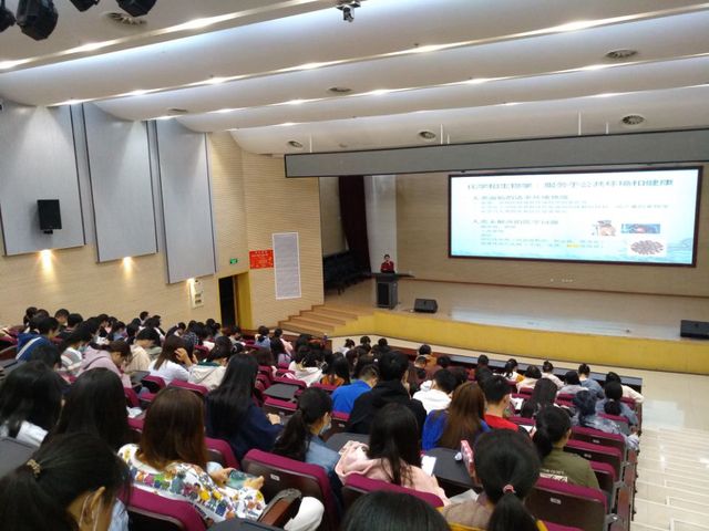 讲座伊始,邓樱花教授结合自己在美国普渡大学访学期间的所见所闻所学,向在场同学介绍了化学、生物两个专业的发展前景、专业特点、专业优势及就业趋势。她指出化学与生物学服务于公共环境和健康,要相信基础科学大有可期。讲座结束,邓樱花与在场同学展开交流互动,鼓励学生要趁着年轻气盛,走出去,带着壮志雄心,走回来。