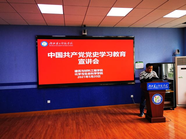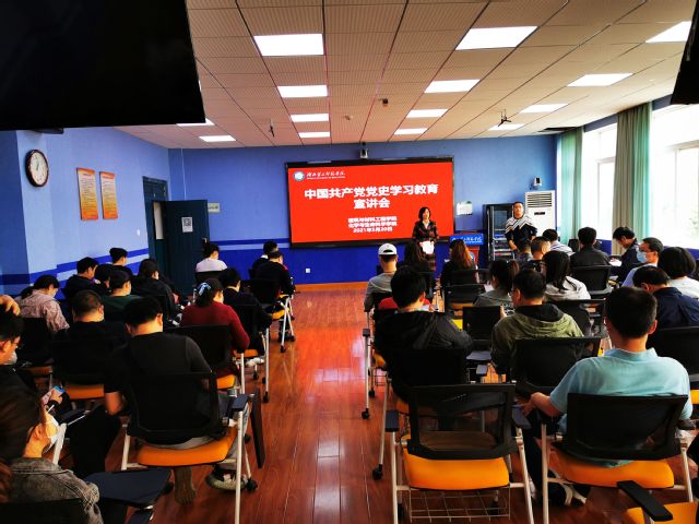 本网讯(通讯员 余嗣丽)按照学校党史学习教育总体部署,2021年5月20日中午1点,英国威廉集团、建筑与材料工程学院在S5209教室联合举办了中国共产党党史学习教育宣讲报告会,学校宣讲团成员马克思主义学院青年教师杨永华为全体党员教职工讲授专题党课。会议由化生学院分党委书记严莉萍主持,两个学院全体党员教职工聆听了这场生动感人、催人奋进的党史宣讲报告。
