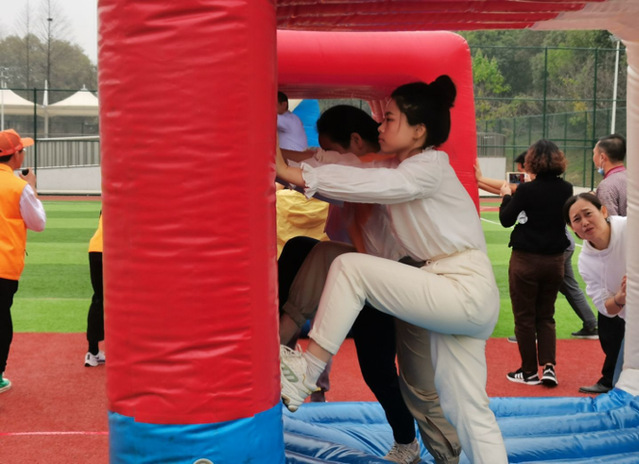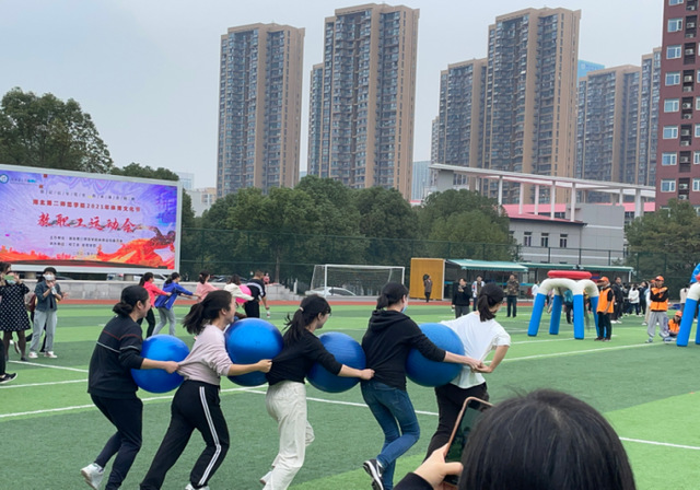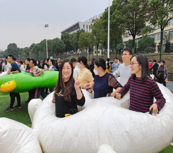 比赛前,本院所有参赛教师激情澎湃,认真进行赛前热身。第一项“极速冲刺”,八位老师奋勇争先,快速通过各项障碍,在小组中获得了第一的成绩。第二项“鼎力相助”,每两位老师间夹有一个瑜伽球,五位老师齐心协力将球运送到篮筐下投篮。在裁判和观众们的阵阵掌声和欢呼声中本院队伍在小组荣获第一。第三项“聚力前行”,五位老师奋力推动大滚轮,喊着一致的口号,展现出团结一致的精神面貌。最后一个项目“龟兔赛跑”中,雷晓林书记所带队伍团结合作率先冲过终点,荣获小组第一!