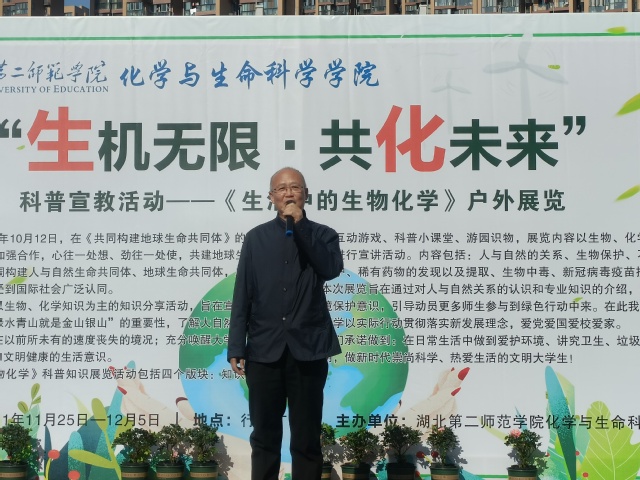 本网讯(通讯员 蒋怡菲) 2021年11月25日13时,“生机无限,共化未来”科普宣教活动之“生活中的生物化学”户外展览于行知广场正式拉开帷幕。校党委常委、副校长黄颂,学校办公室主任王青、宣传部部长方喻、学工部部长金殿中、校团委书记文敏、招生就业处处长刘儒国、资产管理处处长钟建国、综合治理与保卫处处长吴健、后勤集团党总支书记吴晓健、校办副主任谢莎莅临活动现场揭幕,本院党委书记严莉萍、院长曾国平、党委副书记雷晓林及“师友·学友行动”联系单位人员出席,校学生会代表、本院师生参加。