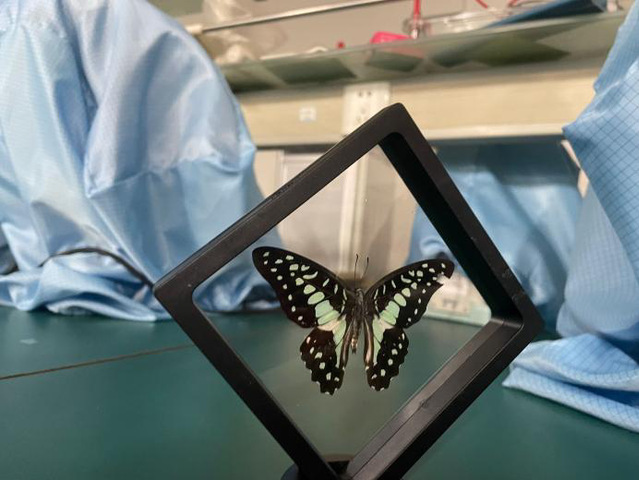 上午10时30分,绿之翼社团的成员们首先将干蝴蝶用水浸泡使其关节软化,一段时间后将蝴蝶放置于昆虫展翅板上,用昆虫针将蝴蝶身体垂直固定于展翅板沟槽中,将两翅展开并整理好,使左右对称,最后用硫酸纸压住两翅配合大头针固定蝴蝶位置。在此过程中大家相互配合互相欣赏,社团内的学长们也悉心解答大家的疑惑并细心指导。经过数小时固定,蝴蝶被移入标本盒中并置于干燥处保存。“这次活动新颖独特,通过制作标本让我们近距离观察到了这些昆虫,了解了生物学知识,凝聚了自然之美。”参加活动的同学纷纷表示道。