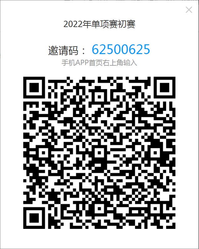 5. 考试形式:采用线下集中、线上答题的方式。线上答题在超星平台进行,参赛者需提前在手机上安装超星APP,并加入2022年单项赛初赛班级,班级号和二维码见下图。加入班级即报名成功。