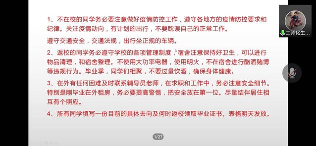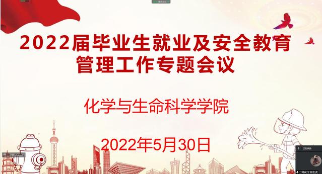 会议开始,孙晨向大家介绍了化生学院22届毕业生目前就业情况,学院截止5月30日,总的就业率达到54%。尚有大量同学没有完成就业。对于涉及到毕业生毕业材料上报和档案问题,孙老师进行了详细讲解。对就业信息上报、网签等进行了指导,毕业后学籍档案去向和选择问题进行了系统分析,要求大家尽快完成信息核对,确保档案准确投递。随后,宦忠虎进行了毕业生安全教育,结合疫情防控工作要求,从“三防”防溺水、防火灾事故和防交通安全到求职安全、工作中要注意的安全细节,都进行了详细的讲解。要求全体毕业生遵守所在地方的疫情防控要求和纪律,按时参加核酸检测,出行做好安全防护措施,工作中注意安全细节,确保个人安全。在毕业求职中注意分辨,谨防上当受骗,毕业生离校后租住房屋最好结伴居住,提高安全意识,遇到困难及时联系辅导员老师。对于2022届毕业生离校手续办理流程和注意事项进行了仔细解读。会议的最后,雷书记对就业工作进行再动员,号召大家积极求职,顺利完成就业,发挥专长,积极投身社会实践。对毕业生安全问题方面进行了强调并祝愿所有毕业生们工作顺意。