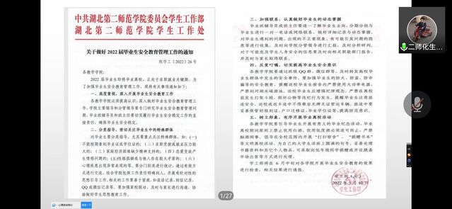 本网讯(通讯员余诗雯)2022年5月20日晚上20点,化生学院召开了2022届毕业生就业及安全教育管理工作专题会议,参会人员有党委副书记雷晓林、学工办主任宦忠虎、辅导员、就业干事孙晨及学院全体毕业生。本次会议就毕业生就业状况、毕业档案问题、毕业生安全教育及毕业生离校有关事宜进行了详细讲解和指导。