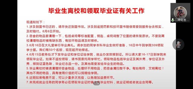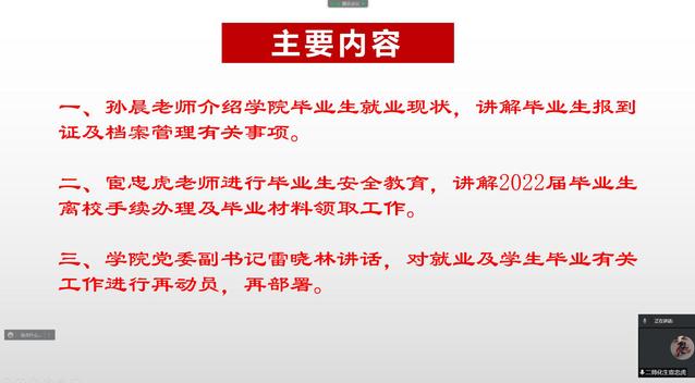此次会议对2022届毕业生们的就业、毕业工作和自身安全起到积极地指导作用。通过本次会议学生们了解了毕业关工作的具体安排,便于毕业生做好计划,顺利返校办理离校手续领取毕业证。