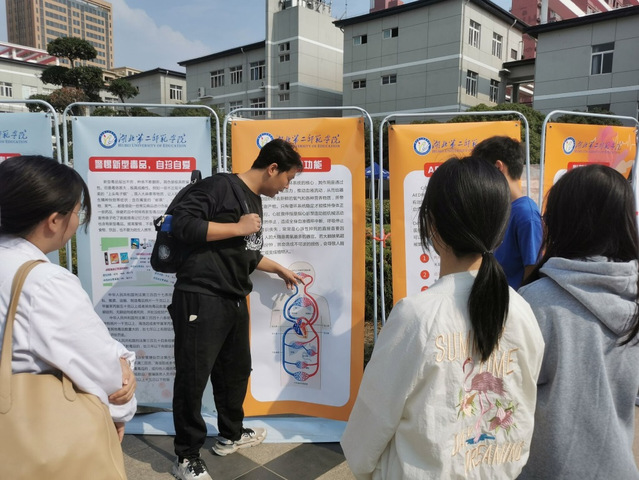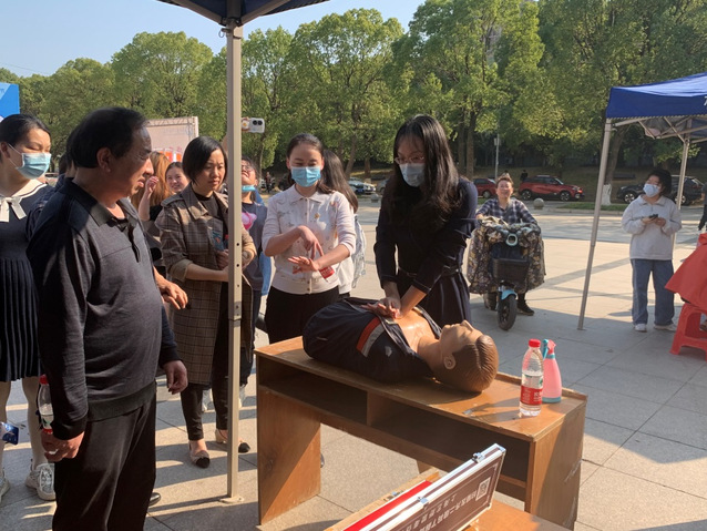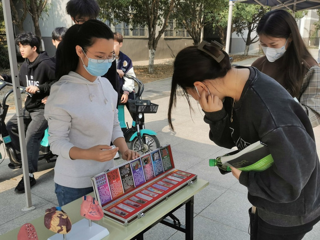在急救知识科普版块,学生志愿者先通过展板向大家讲解了心脏的结构,以及自动体外除颤器和心肺复苏术的原理知识。
