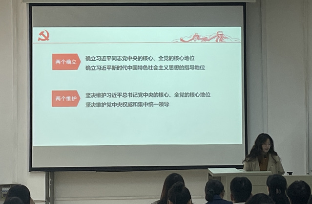 最后,石虹书记以深入学习贯彻党的二十大及全国两会精神为主题讲授党课。她教育引导学生党员要紧跟时政热点,找准时代定位,筑牢思想根基;要善于创新谋新,注重理论学习,锻造实践本领;要坚持求真务实,传承优良作风,担当历史重任。她激励广大青年党员要坚定不移听党话、跟党走,不忘初心,学思践行,在学习工作和生活中充分发挥先锋模范作用,为共建文明美丽校园和实现民族复兴中国梦贡献青春力量。