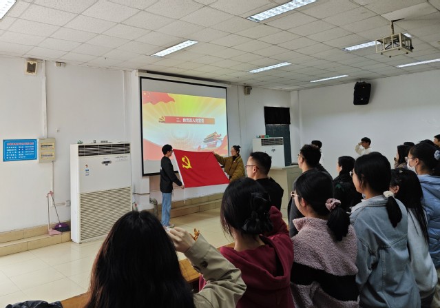 活动伊始,党员老师们为新入党的同学们佩戴党徽,现场全体党员庄严肃立,面向党旗和入党誓词集体宣誓,表达对党的忠诚和为共产主义事业奋斗终身的决心。随后,全体党员共同学习重温了《中国共产党章程》第四章第二十六条内容。学生党员代表唐武垚同学领学分享习近平总书记在“把雷锋精神代代传承下去——纪念毛泽东等老一辈革命家为雷锋同志题词六十周年”座谈会上的重要指示精神,带领党员同志们深刻领悟雷锋精神是共产党人的重要精神谱系,号召大家把崇高理想信念和道德品质追求转化为实际行动,体现在平凡日常,让雷锋精神在新时代绽放更璀璨的光芒。
