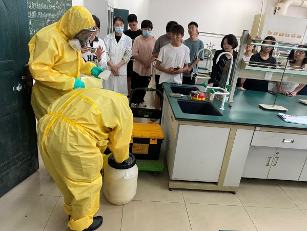 为深入学习贯彻习近平总书记关于安全生产重要指示精神,进一步提高化生学院师生危化品突发事件的应急响应和处置能力,2023年6月6日下午,实验管理办公室组织开展危化品泄露应急演练。化生学院院长曾国平、副院长张宇到场指导,实验室主任黄丽霞带领全体实验室管理人员以及实验课程师生代表参加了演练。