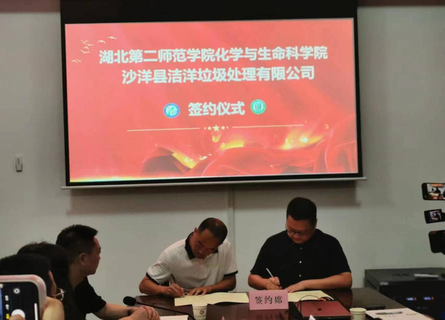 我院副院长张宇沙洋县洁洋垃圾处理有限公司总经理杨雪峰现场签订产学研基地共建协议书,并举行挂牌仪式。