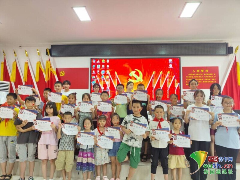 图为结业典礼当天,孩子们拿着自己的奖状和志愿者们一起合影留念。 中国青年网通讯员 邓媛媛 供图