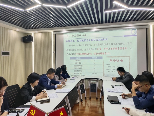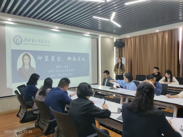 本网讯(通讯员 杨艳琳)为全面落实国家奖学金审评工作,进一步推进“踔厉奋发,笃行不怠”的学风建设,充分发挥我院优秀学子的榜样作用。10月12日中午,我院在学院多功能会议室开展2022-2023年度国家奖学金审评会议。此次会议由负责资助工作辅导员邱梦莹老师主持,参会的评审成员有学院党委书记严莉萍、副书记雷晓林;学院教学副院长陈功轩、化学系主任张明星、生物系主任王亮节以及全体学工老师。会议共分为三个阶段进行:学生答辩、与会评审小组讨论后进行投票、宣布入围人员。