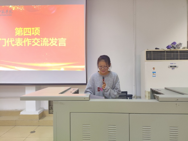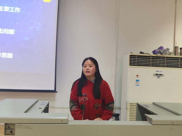 文体部部长熊安霖做部门交流发言,她指出学生干部应为老师与学生服务,激励团学组织成员携手前进,共创辉煌。团学组织“月度之星”代表陈婧怡做交流发言,希望团学组织成员端正态度,协助老师,建立良好的校园环境。纪律监察部部长钟嫄讲解团学组织的考核规则。