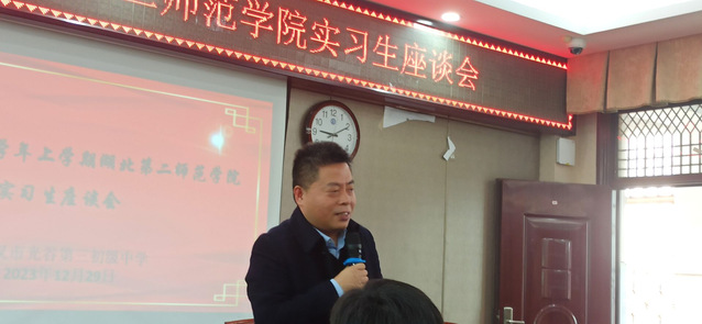 座谈会的最后环节,光谷三初领导和我院陈功轩副院长分别发表了热情洋溢的讲话。他们对指导老师的辛勤付出表示感谢,对实习生在实习期间的表现给予高度评价。同时,领导们也提出了殷切的期望,希望实习生们能够继续努力、热爱工作,为教育事业贡献自己的力量。他们强调了两校之间的紧密合作,期望未来在实习、教研、教育见习等领域能有更深度的交流与合作。