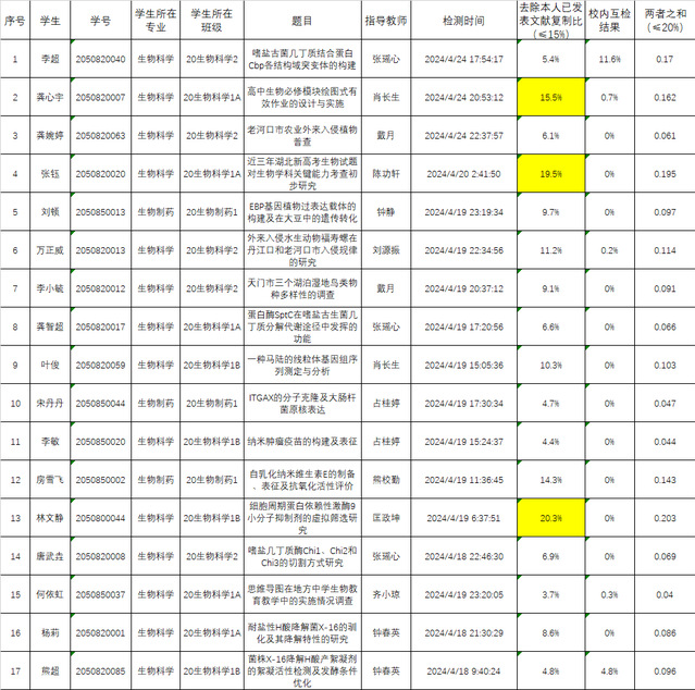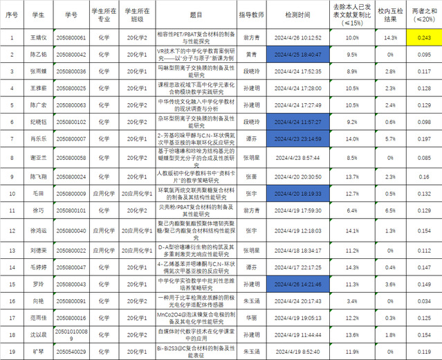 1.黄色标记为查重超出学校“校优秀毕业论文”推荐规定范围,蓝色标记为查重检测时间不符合学校“校优秀毕业论文”要求。