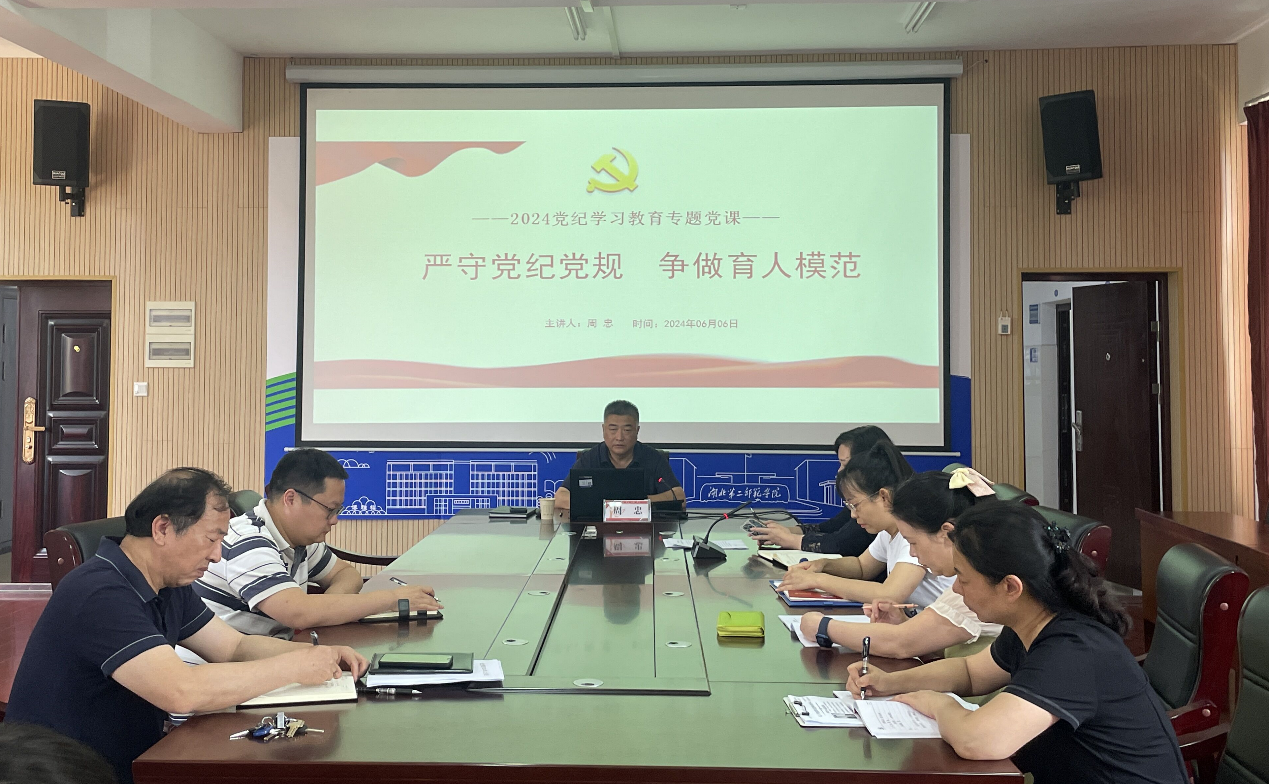周忠以《严守党纪党规 争做育人模范》为题,围绕深刻认识《条例》修订的重大意义、准确把握《条例》修订的主要内容、全面抓好《条例》精神的贯彻执行,结合学校及学院的实际、特点,进行了全面系统、深入细致的解读。周忠指出,党员教师要深刻领悟全面从严治党的理论内涵,贯通理解“六项纪律”实践要求,认真做好本职工作,牢记“为党育人、为国育才”的初心与使命,把党纪学习教育成果转化为推动全面从严治党纵深发展、学校高质量发展的实际成效。
