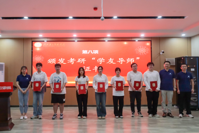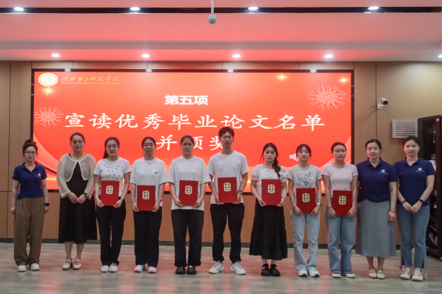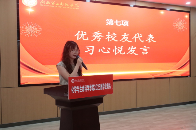 典礼上,学院对优秀毕业生和优秀毕业论文获得者进行了表彰。张灏老师宣读了优秀毕业生名单,张宇、陈功轩副院长为获奖代表颁奖;谭雪青老师宣读了优秀毕业论文名单,王亮节、张明星老师为获奖学生颁发证书。优秀毕业生代表蒋怡菲分享了她的成长故事,她以综合绩点4.2、30余项国家级和省级荣誉以及200小时的志愿服务时长,诠释了“向下扎根,向上生长”的青春力量。教师代表翁方青老师以“师者如光,微以致远”为主题,为毕业生送上暖心祝福。2024届优秀校友习心悦结合自身从校园到讲台的经历,勉励学弟学妹坚守教育初心。典礼还特别为65名考研“上岸”学生颁发“学友导师”聘书,鼓励他们以“传帮带”助力2026届学子逐梦研途。