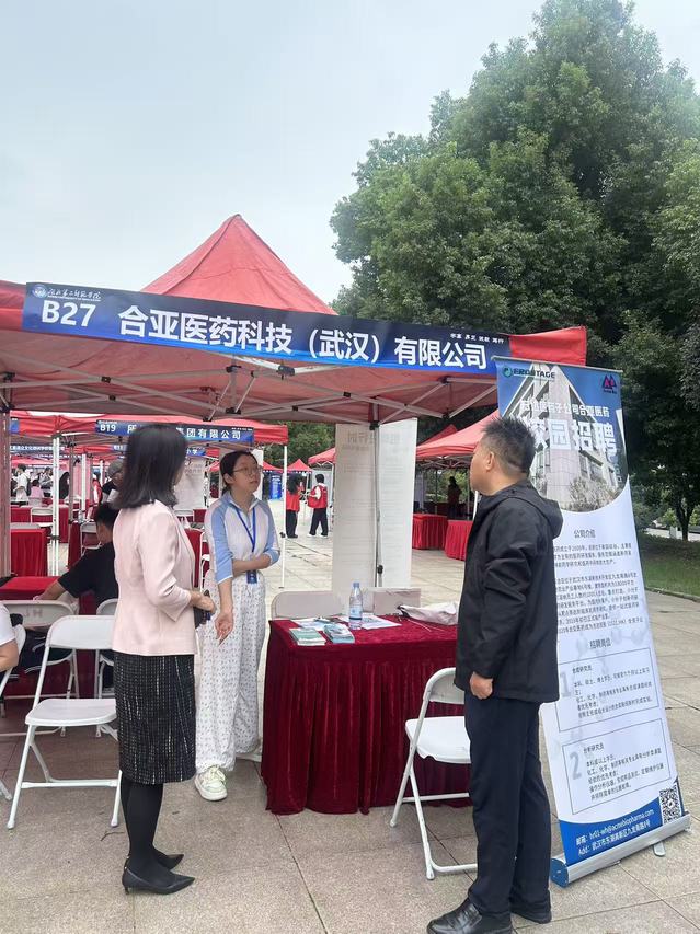 活动启动后,两家企业招聘负责人在展位前开展现场讲解,围绕岗位核心需求与企业情况与学生面对面沟通。合亚医药聚焦生物制药研发领域,详细介绍研发助理、质量检测专员等岗位的日常工作内容、专业技能要求及薪资福利体系,特别说明 “应届生入职后配备专属导师,提供 3 个月带薪培训” 的培养方案;武汉绿孚生物则侧重生产环节岗位,通过展示车间环境照片、生产流程示意图,直观讲解生产技术员、工艺优化助理的岗位职责,强调 “每季度技能考核晋升,年度公费外出学习” 的职业发展路径,吸引学生驻足咨询。