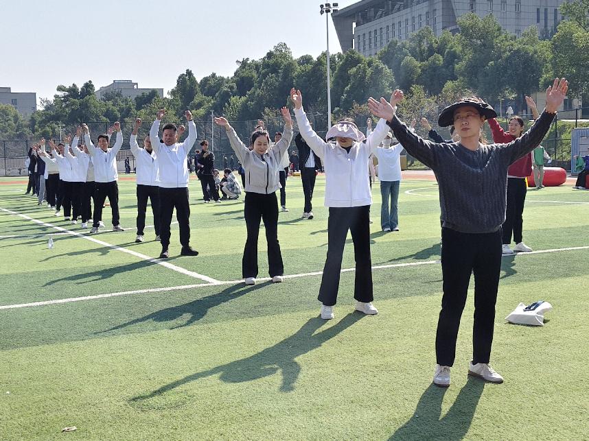 赛前,在动感十足的旋律中,老师们在专业教练的带领下开始了系统的赛前热身。伸臂、转体等一系列准备动作不仅舒活了筋骨,更点燃了全场的参赛热情。大家笑容洋溢,相互鼓励,现场气氛迅速升温,为接下来的激烈角逐做足了身体与情绪的双重铺垫。
