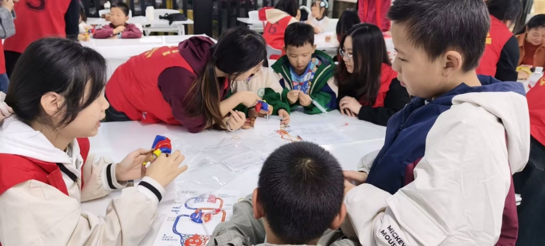 “快看!血液小火车从‘动力泵’出发啦!”活动现场,孩子们围着一个个色彩鲜艳的心脏模型兴奋不已。这些由我院师生精心准备的教具,成了最受欢迎的“玩具”。