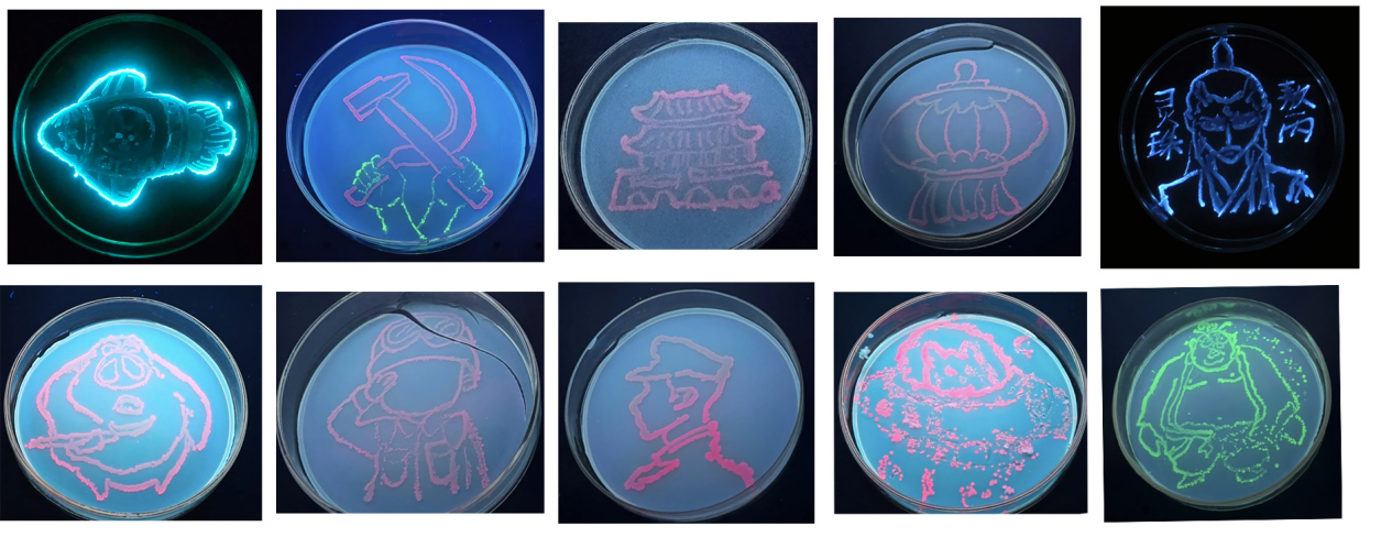 展台聚焦于两类特殊微生物:一类是经基因工程改造、携带不同颜色荧光蛋白的大肠杆菌;另一类是天然能发出蓝色荧光的费氏弧菌。在专用固体培养基上,同学们化身“生物画师”,亲手以微生物为“颜料”,勾勒出各种创意图案。随着培养过程推进,素雅的培养基上逐渐显现出色彩斑斓的荧光画面,红、绿、蓝等荧光交相辉映,生动展示了微生物世界的奇妙与基因工程的深远意义。