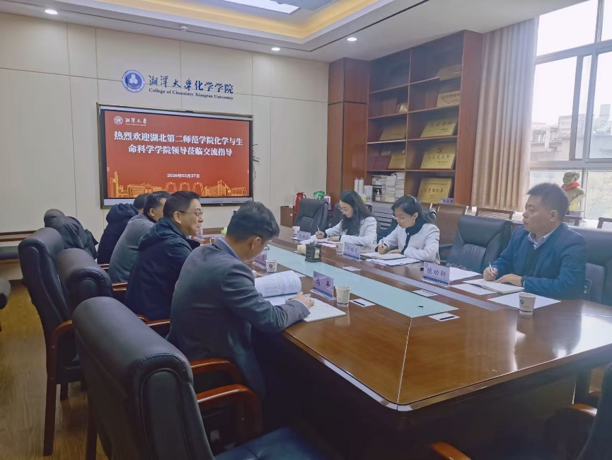 (通讯员 张雅琼)2026年3月27日,我院院长邓樱花带队,副院长陈功轩、青年教师张雅琼随行,赴湘潭大学化学学院开展调研交流活动。湘潭大学化学学院院长裴勇、副院长彭圣明等相关领导热情接待我院一行,双方围绕能源化学专业建设、人才培养等核心议题召开交流座谈会,深入探讨人才培养的新思路。